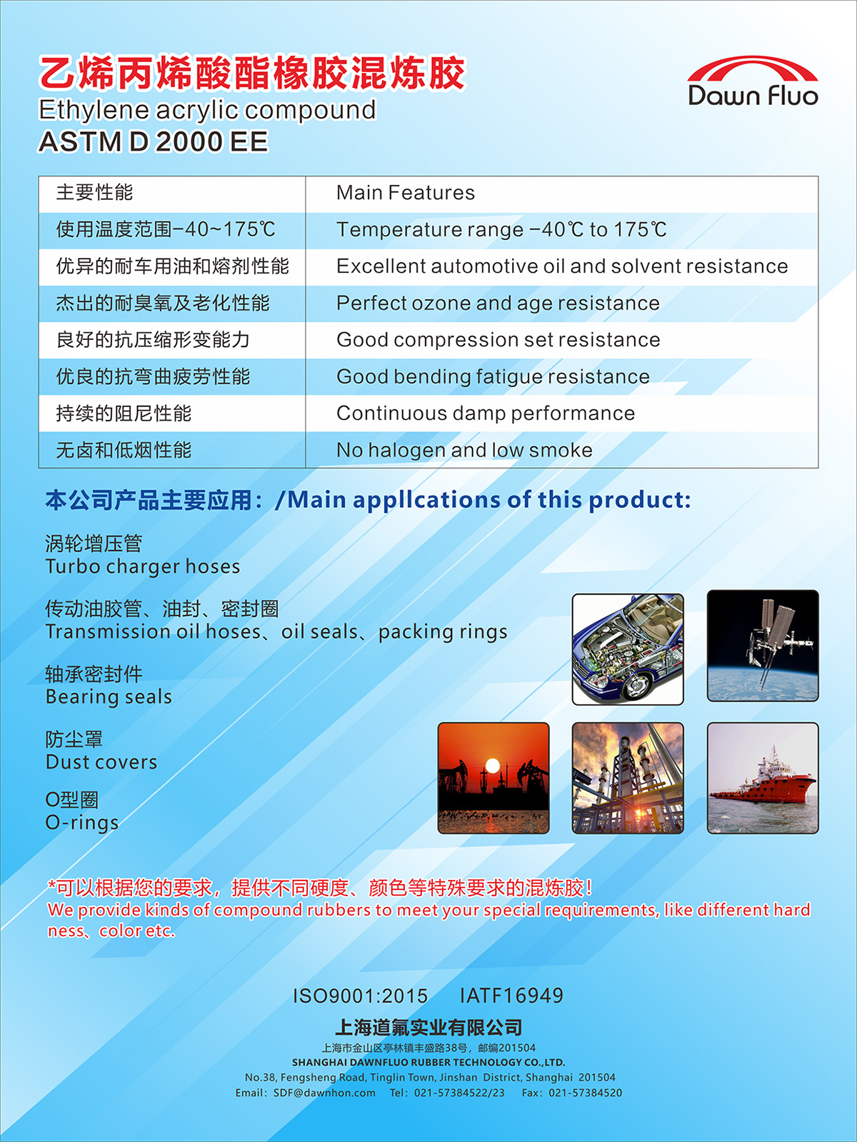 乙烯丙烯酸酯橡膠(AEM)分為二元膠和三元膠,二元膠由乙烯(E)/ 丙烯酸甲酯(MA)組成,三元膠由E / MA / 提供硫化位置的單體(CS)組成。二元膠只能采用過(guò)氧化物硫化,而三元膠由于含有提供硫化位置的第三單體,可采用胺類硫化劑硫化,當(dāng)用于電纜采用高壓蒸汽連續(xù)硫化時(shí),三元膠也可采用過(guò)氧化物硫化。乙烯丙烯酸酯橡膠具有優(yōu)異的耐高溫、耐熱的礦物油、液壓油、耐候及低溫性能,但不耐低苯胺油和極性溶劑。